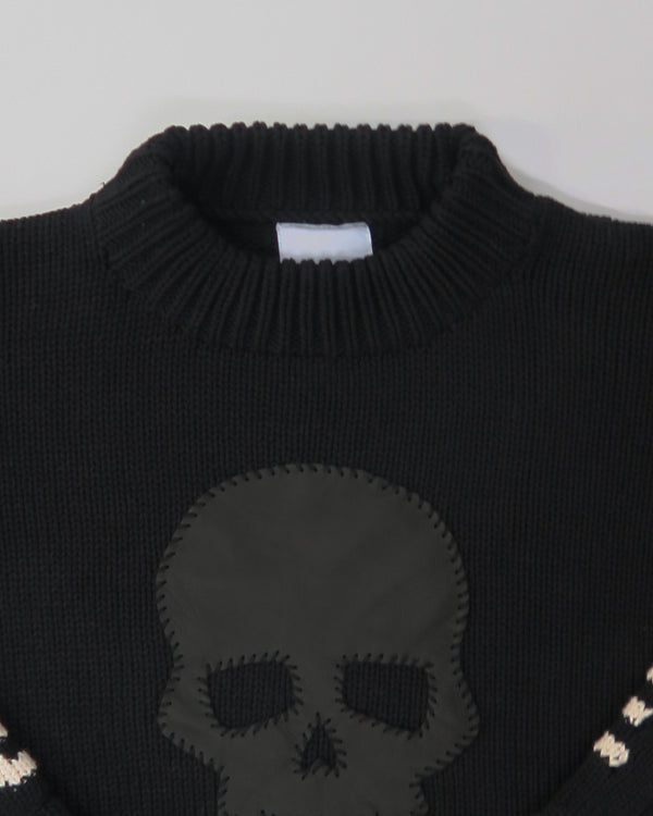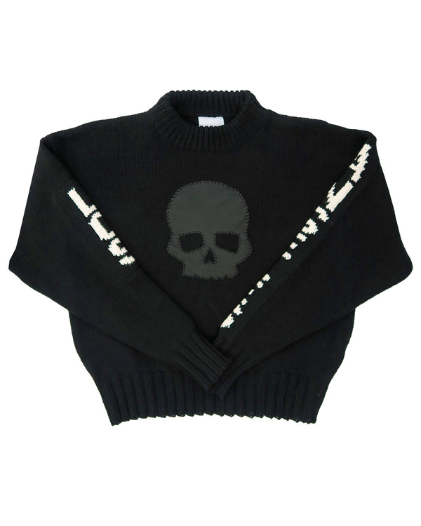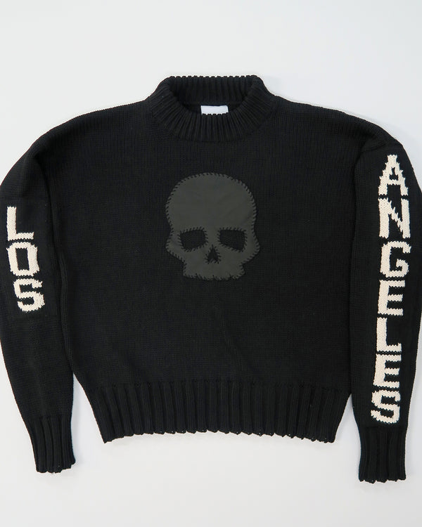 The Los Angeles Crewneck Sweater is hand loomed in a pre-washed recycled cotton. This sweater is a classic crewneck silhouette, making it an easy sweater staple for your Fall wardrobe (or any wardrobe for that matter as the cotton yarn content gives it a season-less flare). It features hand-loomed LOS ANGELES text knit and than appliquéd to the long exaggerated sleeves and a dramatic fold over rib neckline. This specific design features a soft leather skull that is hand stitched to the face of the sweater. Unisex sizing.
